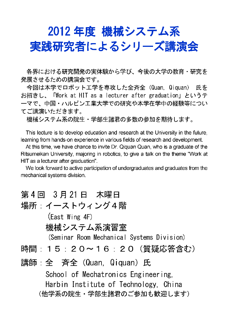On March 21, Dr. Qiquan Quan and Dr. Xiaodong Wu who are alumni of Malab came to Ritsumeikan to lecture about how things are going.