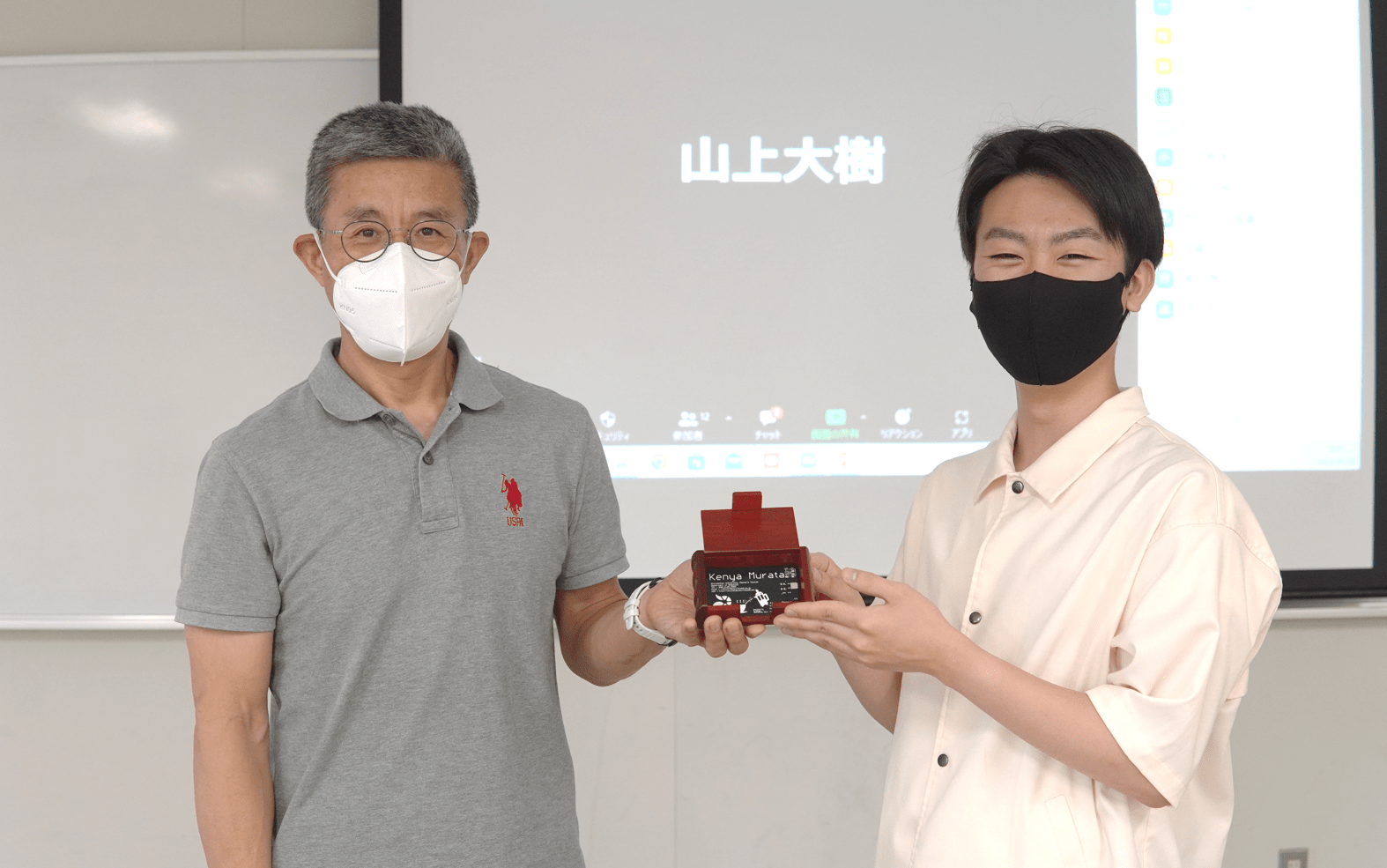 The best presentation was Mr.Murata(M1)’s “electronic board name card” ! He made an electronic board name card and programmed it so that you can see a pot pouring coffee (appears in LED light) in a cup ! (He actually works at a coffee shop)